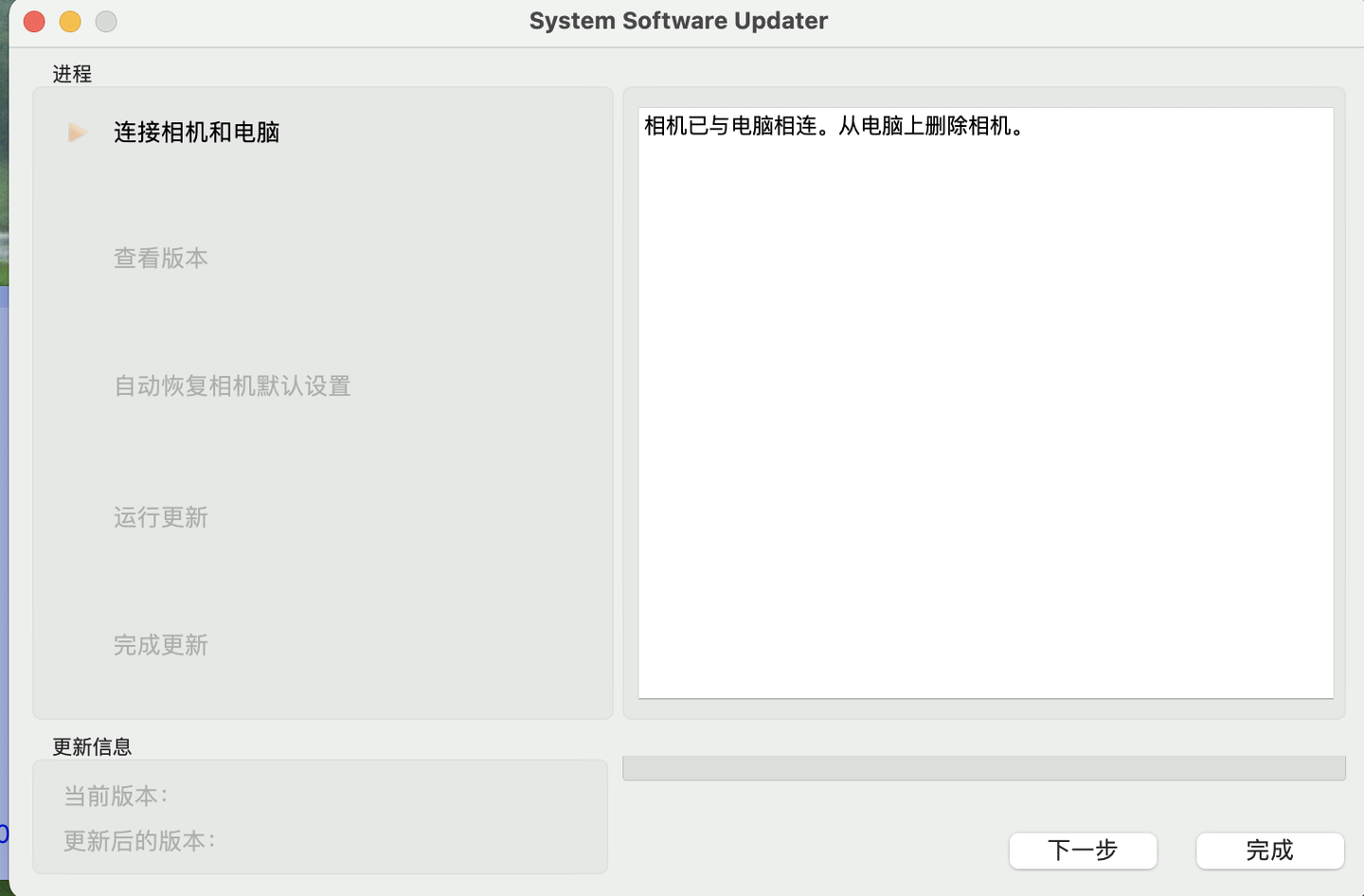 我们连接相机尝试运行固件更新器。结果第一步就卡住了:电脑识别到了相机,但更新器提示「相机已与电脑相连。从电脑上删除相机」。