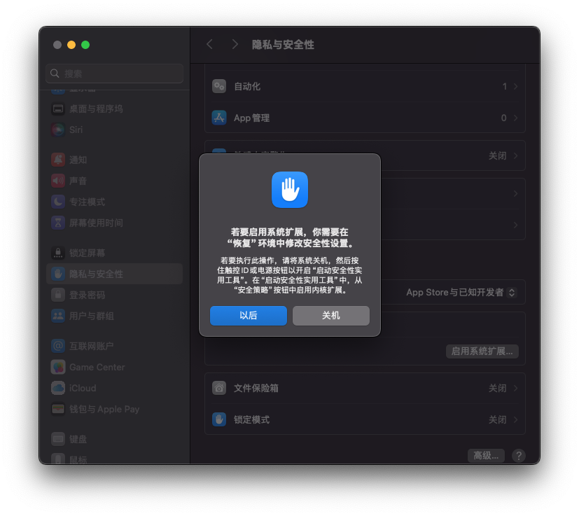 3. 溯源:内核扩展的博弈 重新回溯过程,我意识到问题可能出在更底层的权限上。再次深入检查系统设置,终于发现了症结所在:系统安全性设置阻止了旧版系统扩展的加载。
